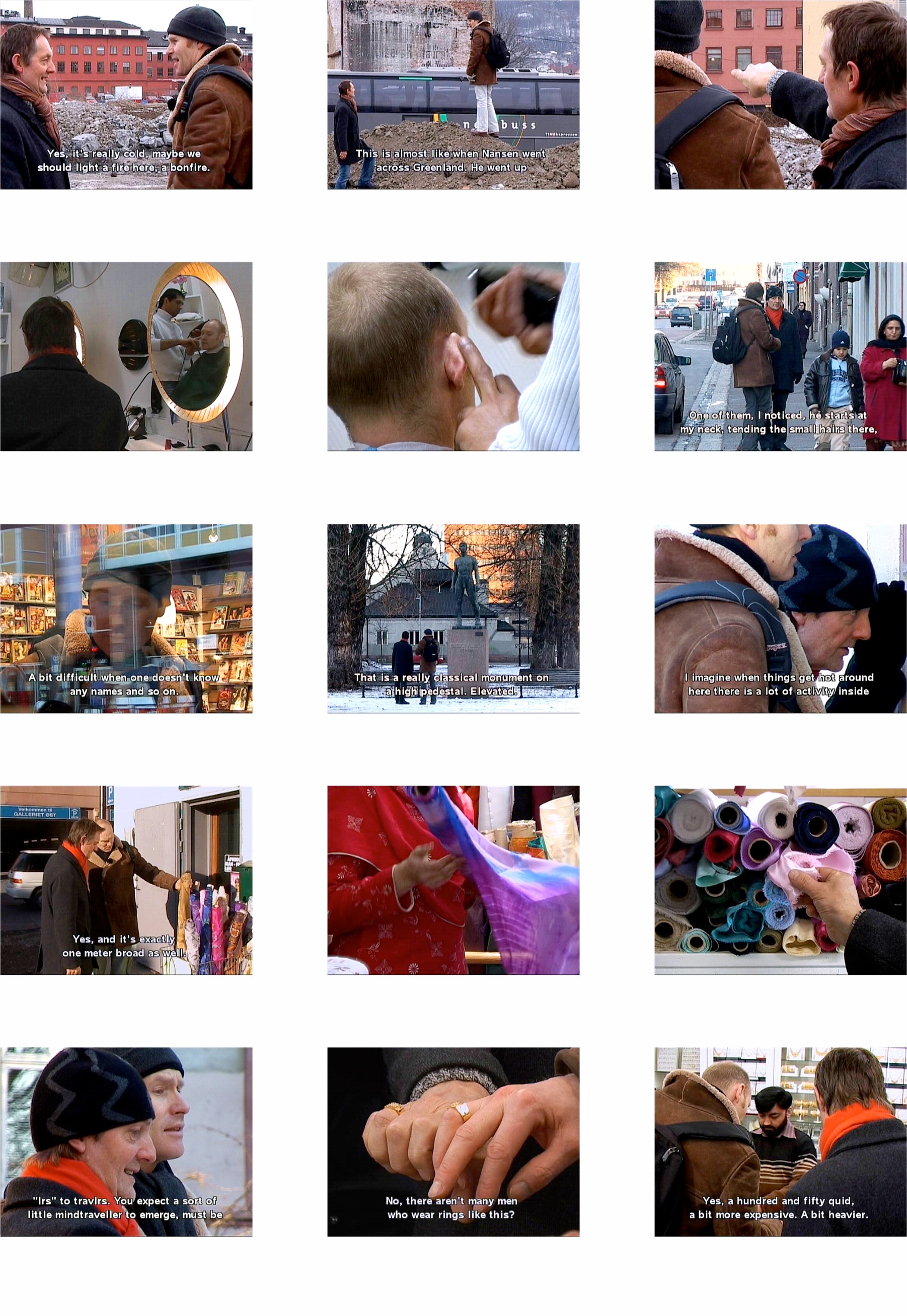 Per and Torbjørn are “exploring” the multi cultural area Grønland in Oslo. Their journey starts at one of Grønlands many construction sites and goes further through different passages, shops and public places. We meet them outside the vacant Human rights building, in a textile shop and at the hairdresser. In a trivial and funny way they comment on their surroundings, but we never get to know who they really are and where they come from.